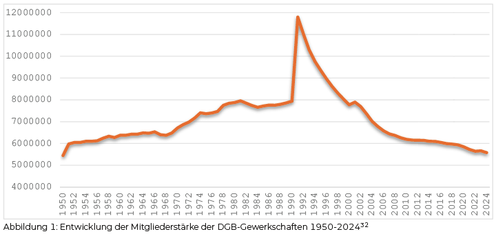 Die Konfliktfähigkeit von Gewerkschaften lässt sich zuallererst anhand ihrer Mitgliederstärke bzw dem Organisationsgrad der Beschäftigten ermessen. Wie Abbildung 1 zeigt, stieg die Mitgliederzahl der DGB-Gewerkschaften in den 1970er-Jahren, der Hochzeit des westdeutschen Korporatismus, deutlich an. Von dem Niveau der 1980er-Jahre sank sie dann allerdings stark – bis auf den vereinigungsbedingten Ausreißer 1990, hier kamen die Mitglieder der DDR-Gewerkschaften hinzu, verließen aber während der massiven wirtschaftlichen Umwälzungsprozesse die Gewerkschaften schnell wieder – ab. In Folge der Krise 2008/2009 hatte sich der Trend bedingt stabilisiert, die Gewerkschaften konnten den Mitgliederschwund zumindest verlangsamen. In den letzten Jahren ist unter dem Strich aber wieder ein eindeutiger Verlust zu verzeichnen.