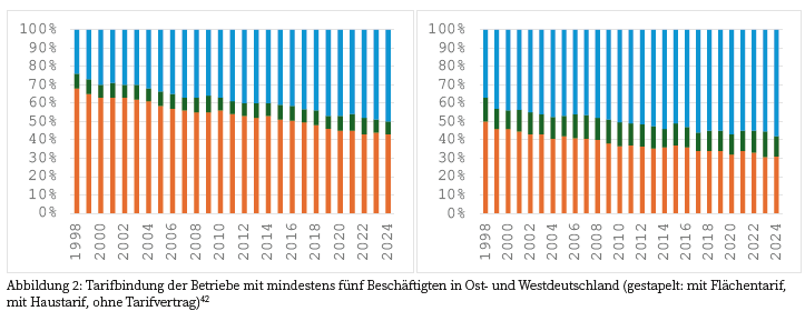 Auch für die Tarifbindung und die Verbreitung von Betriebsräten jeweils in Betrieben mit mehr als fünf Beschäftigten lassen sich entsprechend Erosionstendenzen der industriellen Beziehungen festmachen. Da die Ausgangsbedingungen und Wirtschaftsstrukturen in Ost- und Westdeutschland durchaus unterschiedlich sind, ist hier eine getrennte Betrachtung sinnvoll (Abbildung 2): In Westdeutschland ist die Tarifbindung von etwas unter 80 % im Jahr 1998 auf etwa 50 % im Jahr 2024 deutlich zurückgegangen. In Ostdeutschland ist die Tarifbindung bereits 1998 deutlich niedriger und inzwischen von gut 60 % auf nur knapp über 40 % abgesunken. Zudem ist die Betriebsebene dort tarifpolitisch durchgehend relativ wichtiger. Ebenso ist laut IAB-Betriebspanel auch hinsichtlich des Anteils der Betriebe mit mindestens fünf Beschäftigten, die einen BR haben, ein Rückgang zu verzeichnen (ohne Abbildung): In Westdeutschland sank die Quote von 48 % (2012) auf 45 % (2024) und in Ostdeutschland im selben Zeitraum von 49 % auf 46 %. Zudem wird einer aktuellen Untersuchung zufolge jede fünfte Betriebsratsgründung behindert, was die fragile Akzeptanz der betrieblichen Mitbestimmung bei AG unterstreicht. Die Weiterentwicklung des Betriebsverfassungsgesetzes auch im Hinblick auf die Digitalisierung und zB veränderte Unternehmensorganisation und Beschäftigungstypen stockt trotz einer Bundesratsinitiative 2025 bisher.