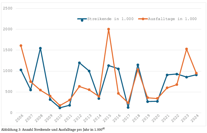Fraglich ist, ob damit auch eine zunehmende Konfliktintensität einhergeht. Eine abnehmende Einhegung des Klassenkonflikts und fehlende friedliche Konfliktaushandlung könnte Gewerkschaften dazu zwingen, häufiger zu Arbeitskämpfen aufzurufen. Gleichzeitig schwächen sinkende Mitgliedszahlen auch die Mobilisierungsfähigkeit. Abbildung 3 lässt keine eindeutige Aussage zu, allenfalls ist vor dem Hintergrund sinkender Mitgliedszahlen der Gewerkschaften kein Rückgang der Streikaktivität zu verzeichnen. Weniger Gewerkschaftsmitglieder streiken also genauso häufig, wie es vor einigen Jahren eine größere Zahl tat.