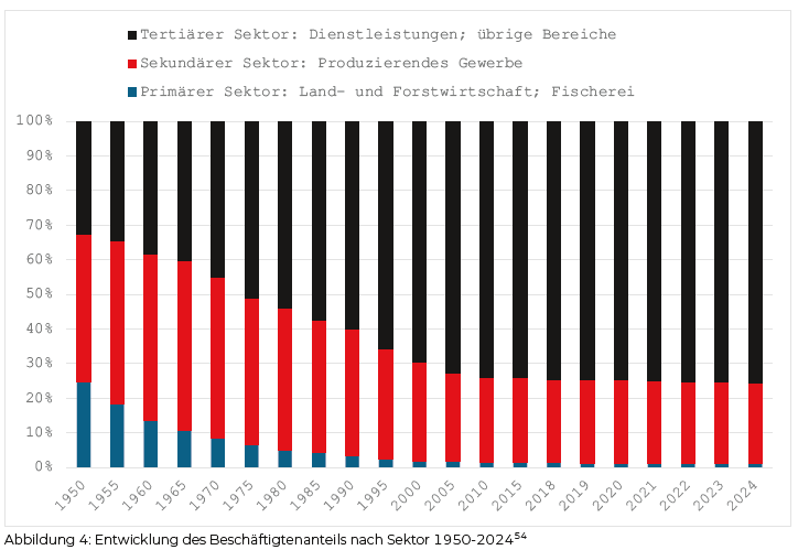 Im dritten Schritt will ich auf die Einstellungsebene eingehen, da auch der Rückhalt der Konfliktpartnerschaft in der Bevölkerung oder zumindest bei den Beschäftigten für meine Fragestellung relevant ist. Zunächst ist wichtig festzustellen, dass in Deutschland – wie in allen westlichen Industrienationen – der Anteil der Beschäftigten in den traditionell gewerkschaftlich gut organisierten Branchen des verarbeitenden Gewerbes von 42,9 % im Jahr 1950 auf 23,3 % im Jahr 2024 zurückgegangen ist (Abbildung 4). Im selben Jahr ging auch die Beschäftigung im primären Sektor von fast einem Viertel auf nur noch 1,2 % zurück. Der Anteil des tertiären Sektors nahm entsprechend von knapp einem Drittel auf 75,5 % zu. In den vergangenen Jahrzehnten ist die Erwerbsbevölkerung außerdem zunehmend migrantischer geworden und auch die Erwerbsbeteiligung von Frauen hat deutlich zugenommen.
